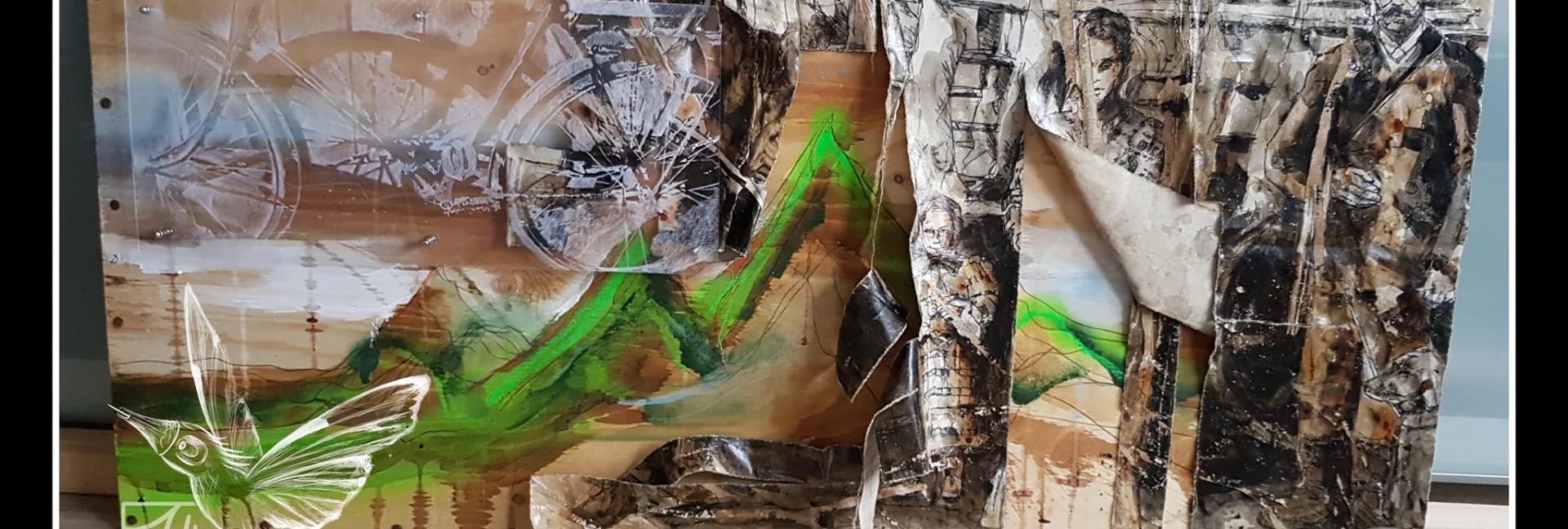 Davor die zerrissene Leinwand mit dem Bild einer Wildererfamilie: die Familie, die Halt geben sollte, als Komplizen; Straftat als Erfolg, zerrüttet, mitgefangen + mitgehangen – auf Folie gezeichnet und im Umdruckverfahren auf Leinwand gebracht, zerknüllt, zerrissen und mit verrosteten Reißnägeln (das war gar nicht so leicht, die Dinger zum Rosten zu bringen) aufgespannt.