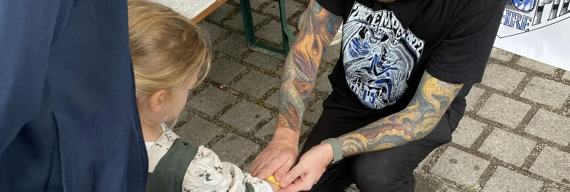 Auch mit Klebetattoos verzierten wir, genauer gesagt Piercer Thomas und Stephan etliche Kinder. Genau zählen konnten wir nicht, aber es dürften rund 200 glückliche Kinder gewesen sein. Die Schlange vor unserem Stand nahm kein Ende, eine Pause war an diesem Tag für uns eher nicht bzw. nur im dringendsten Notfall ? möglich.