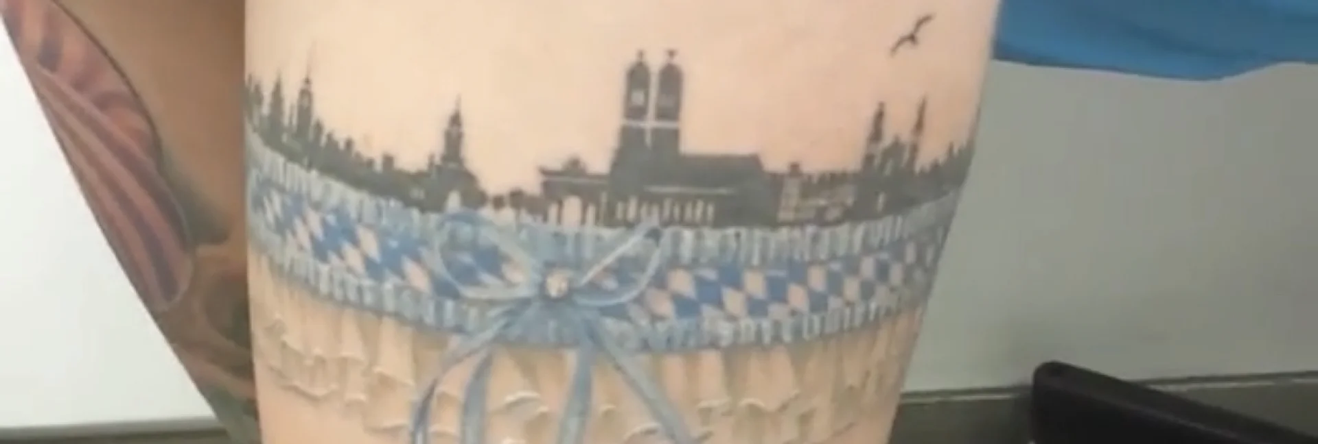 Die München Skyline als Tattoo – und ein Strumpfband als Zugabe