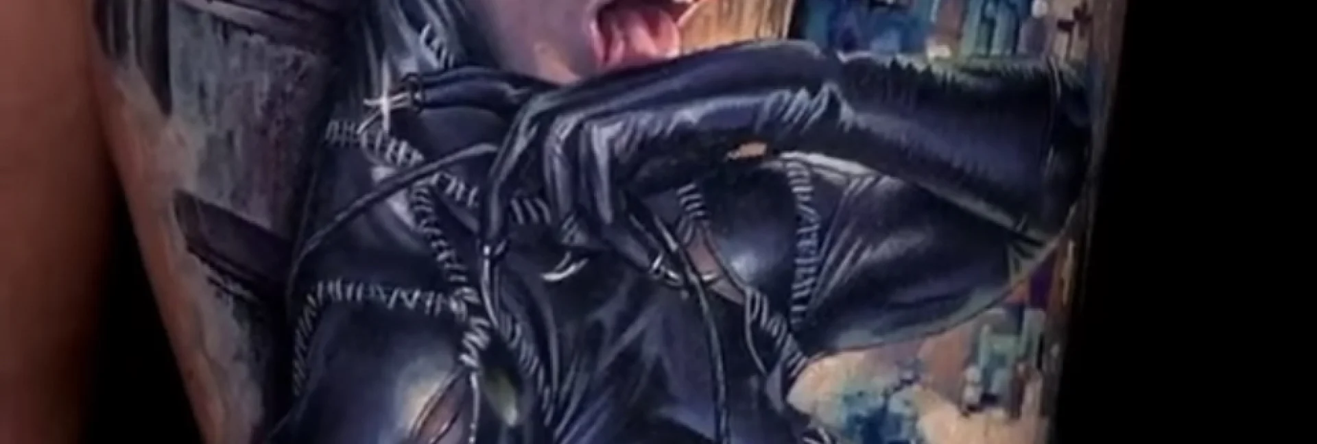 Eine seiner neuesten Arbeiten wollen wir heute einmal besonders herausstellen: Das Catwoman-Tattoo: Catwoman selber ist bereits abgeheilt, nur der Hintergrund ist frisch. Unserer Meinung nach wieder einmal ein Meisterwerk.